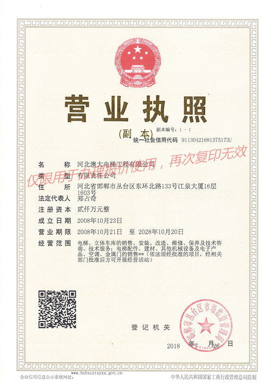 河北澳大電梯工程有限公司是集電梯銷售、安裝、維護保養為一體的專業化電梯公司。公司具有國家質量監督檢驗總局頒發的“電梯安裝改造維修A級”資質許可證。下設市場部、工程部、維保部、技術部、行政部及電梯配件公司。